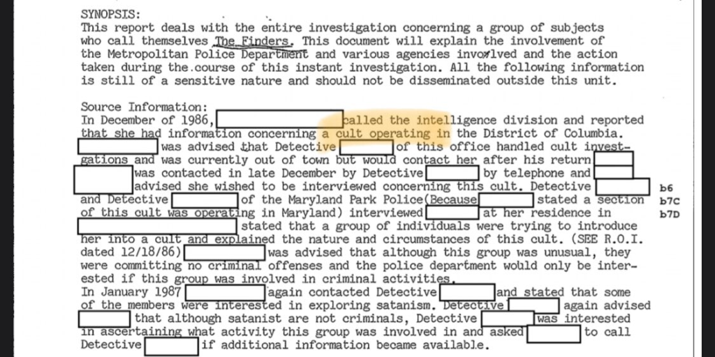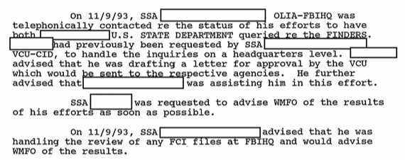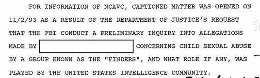 これは、FBIが「The Finders」の捜査に関する多くのファイルを機密指定解除したばかりのCIAグループと同じです。ただし、罪を犯した者を保護するために、多くの名前は黒塗りのままです。(下記参照)
