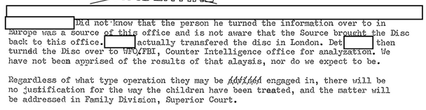 「1987年2月18日午後3時30分頃、 [編集者注]は、S/A [編集者注]と、拾得人のメンバーが当局と接触した可能性について話し合いました。S/A/ [編集者注]は慎重ではありましたが率直に回答しています。彼は、[編集者注]イザベル(故人)が1950年から1971年まで当局の職員であったことを確認しました。