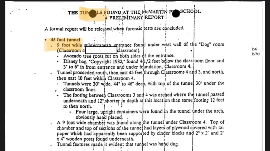 この事件における論争の1つは、子供たちの証言と、学校の中心の下にトンネルや部屋があるのではないかという憶測でした。否定派は最終的に、これを「狂気の陰謀論」の領域に押し込めることに成功しました。