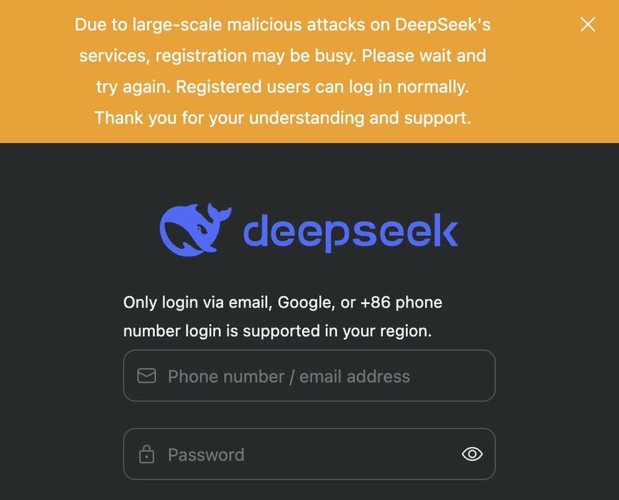 別の動きとして、正午頃、DeepSeekのAPIランディングページに次のような警告が掲載されました。「DeepSeekのサービスに対する大規模な悪質な攻撃により、登録が混雑している可能性があります。しばらく時間をおいてから再度お試しください。登録済みのユーザーは通常通りログインできます。ご理解とご協力に感謝いたします」