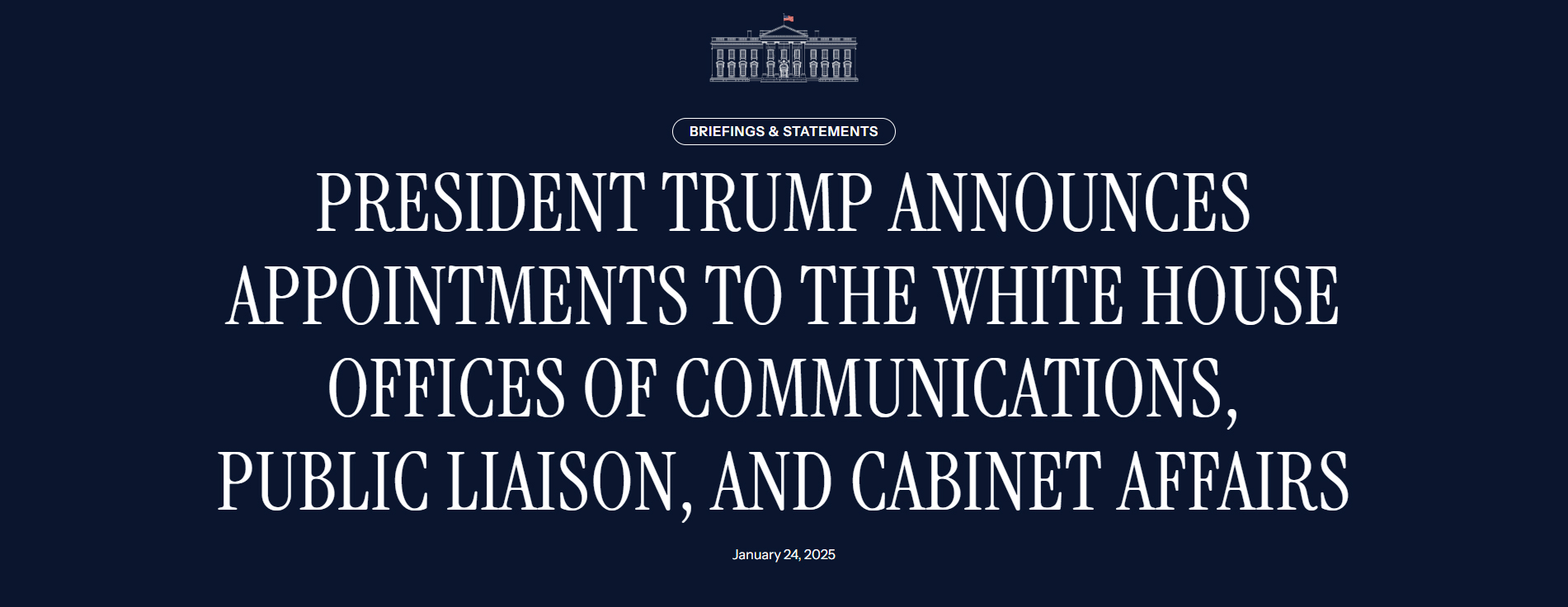 トランプ大統領は、大統領補佐官兼ホワイトハウス広報部長のスティーブン・チャン氏と、大統領補佐官兼報道官のカロライン・レヴィット氏の任命をすでに発表しています。本日の発表は以下の通りです。