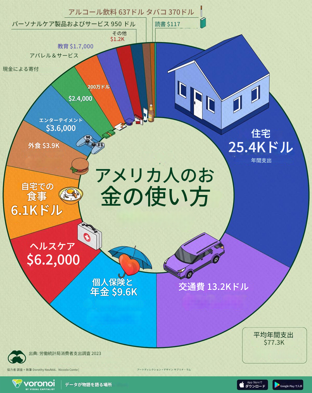 このグラフは、Visual Capitalistのドロシー・ノイフェルド氏によるもので、労働統計局による消費者支出調査2023年のデータに基づく、米国人の年間平均支出額を示しています。