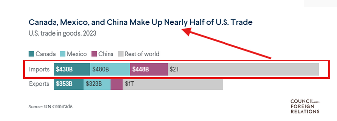 米国は2023年にカナダ/メキシコから9100億ドルを輸入しました。