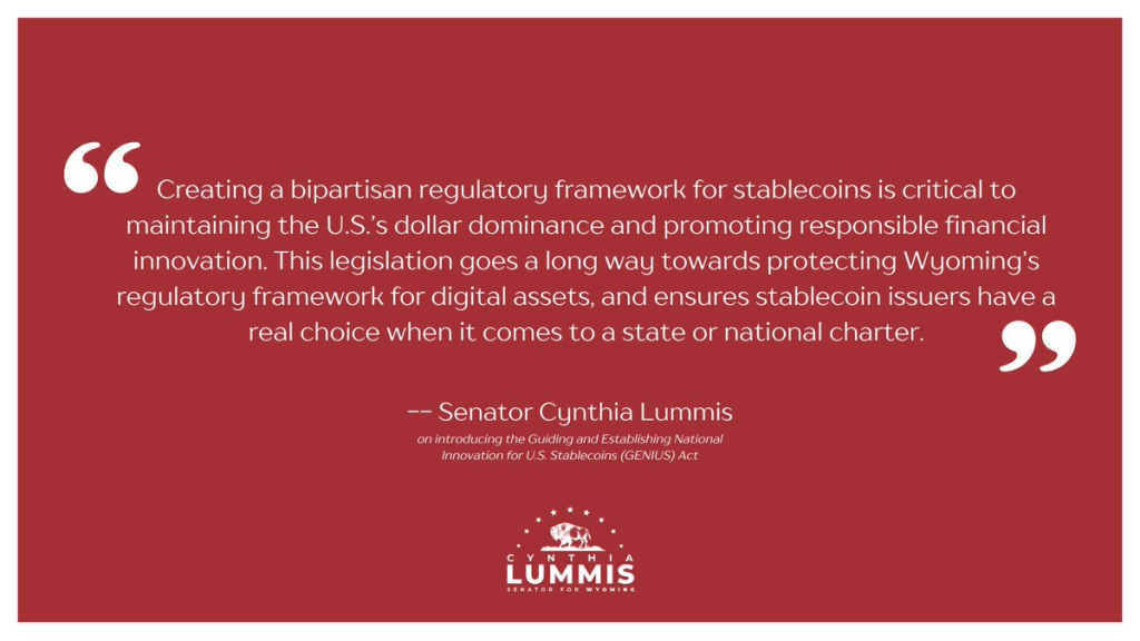 ハガティ氏の「米国安定通貨のための国家イノベーションの指導と確立(GENIUS)法」は、ティム・スコット、キルステン・ギリブランド、シンシア・ルミスの各上院議員から支持を受けました。