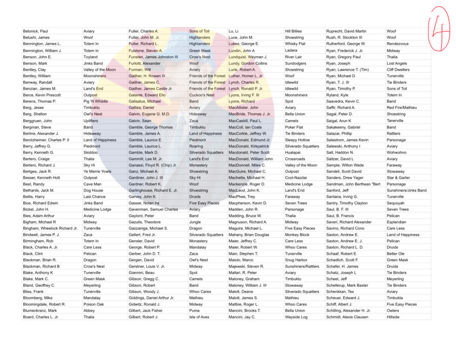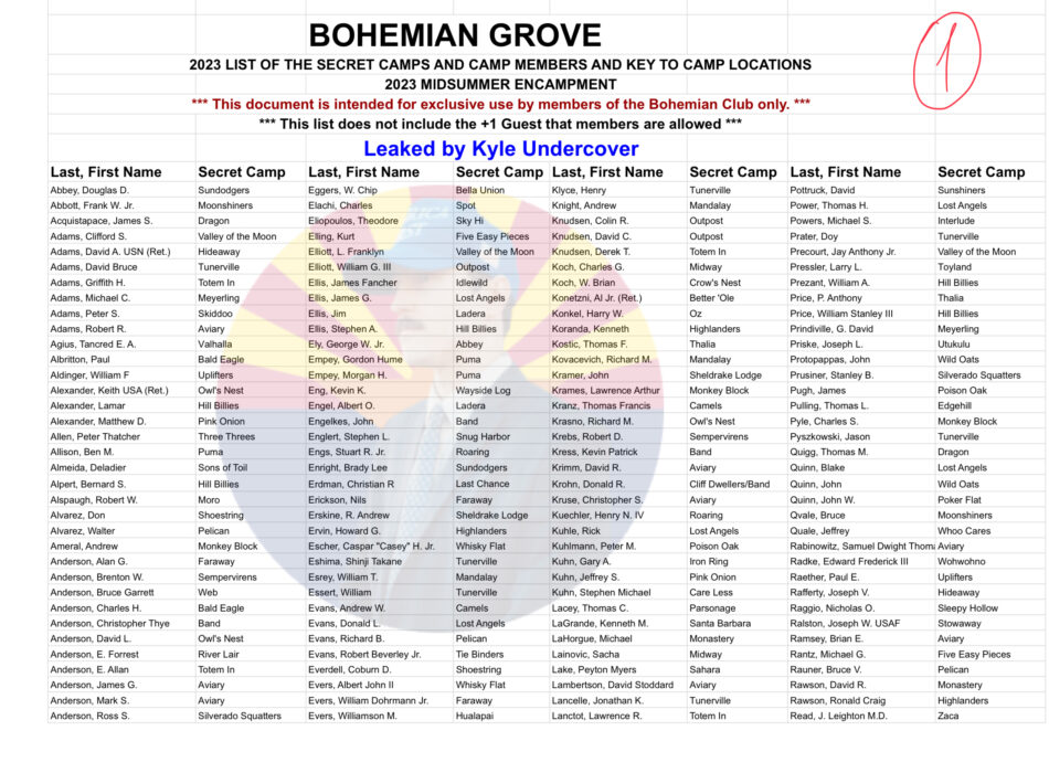 2023年に流出した文書は、ボヘミアン・グローブの内部構造を垣間見ることのできる貴重なもので、秘密のキャンプとその尊敬すべきメンバーのリスト、そしてその場所を解読するための暗号の鍵が記載されている。この暴露は、世界で最も高級なクラブのひとつであるボヘミアン・グローブのファサードにめったにない亀裂を入れ、神聖な敷地内で繰り広げられる秘密の活動を垣間見せるものである。