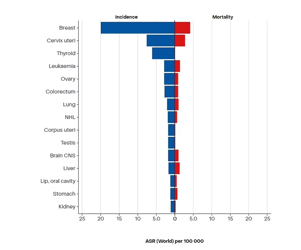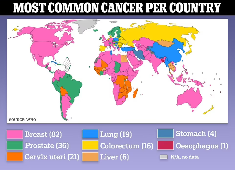 世界では、乳がんはアメリカ、イギリス、カナダ、インド、南アフリカ、オーストラリア、メキシコを含む数十カ国で最も多く見られる病気であり、これは検診がより身近になったためかもしれない。