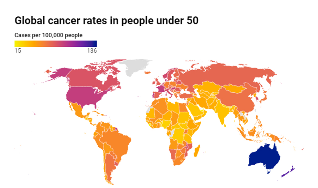 ほぼすべての大陸で、50歳未満のさまざまな種類のがんが増加している。これは、ほとんどの医師が若い人のがんを探す訓練を受けていないため、この年齢層では病気が発見されるのが遅くなる傾向があり、特に問題である。