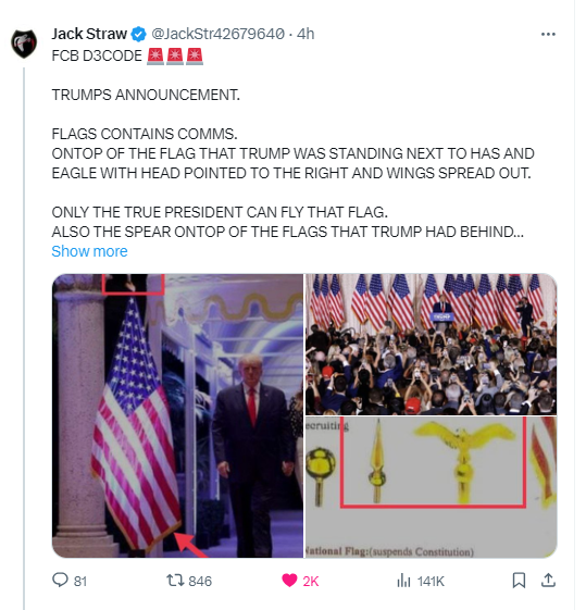 しかし、この旗には見た目以上のものがある。その布地には幾重にも意味が込められており、そのひとつひとつがより深い。鋭いまなざしで翼を広げた鷲は、力強さだけでなく、新たな高みへと舞い上がる覚悟を意味している。そのような運命の旗を掲げるにふさわしいのは誰なのか。真の大統領だけが、この権威の紋章を主張できるとトランプは主張する。
