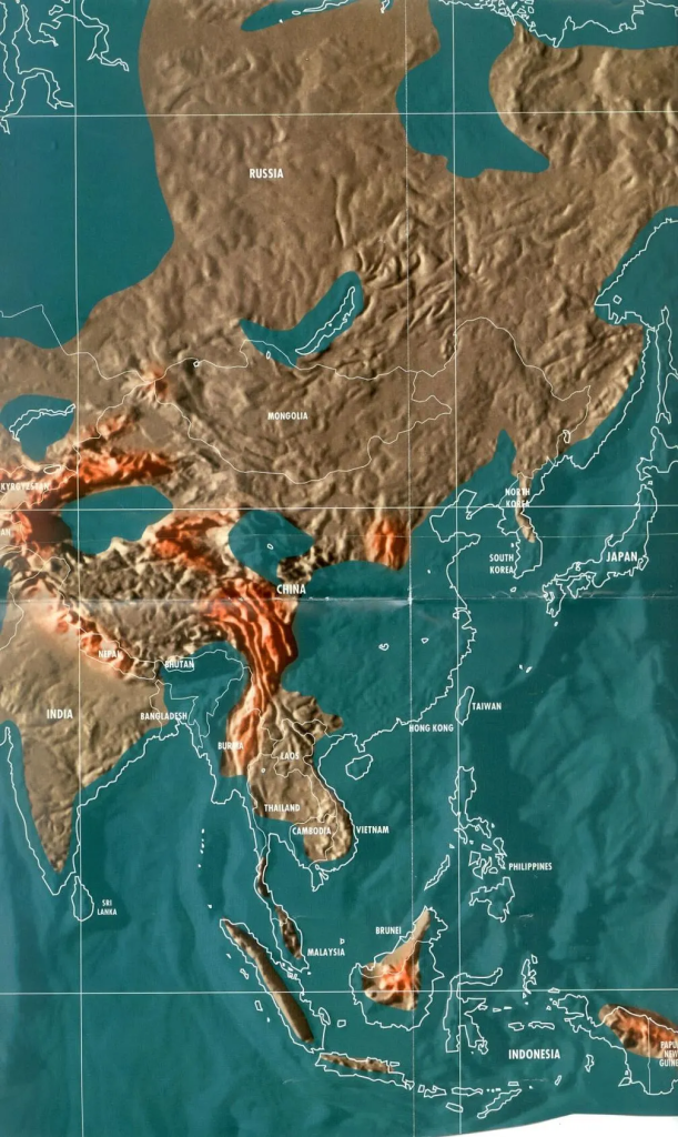 中国の沿岸地域全体が数百マイル内陸に押しやられます。インドネシアは分裂しますが、一部の島は残存し、新たな土地が出現します。フィリピンは完全に海中に消滅します。アジアは、これらの劇的な変化により、その陸地の大部分を失うことになりますが、最終的にはまったく新しい土地が出現することになります。