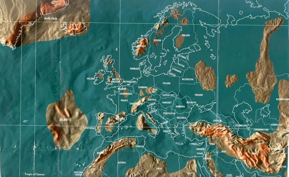 フランスの大部分が水没し、パリ周辺の地域に島が残ります。 スイスとフランスは完全に新しい水路で隔てられ、ジュネーブからチューリッヒまでが結ばれます。 イタリアは完全に水没し、ヴェネツィア、ナポリ、ローマ、ジェノヴァは海面下に沈みます。 高い標高が新しい島として形成されます。 シチリア島からサルデーニャ島にかけて、新しい土地が隆起します。