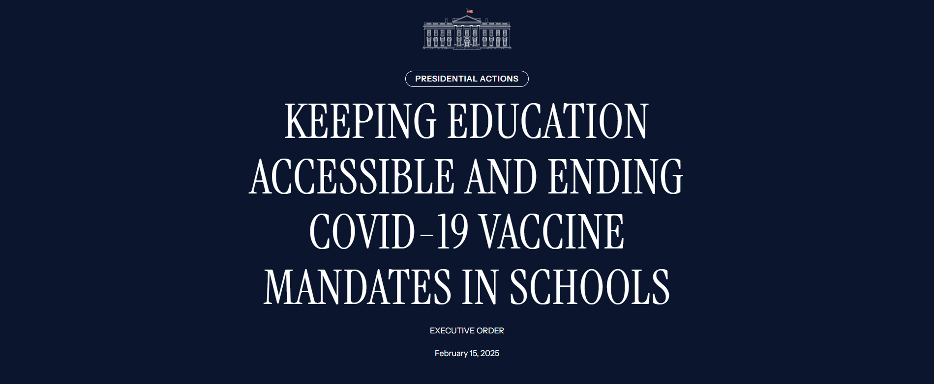 第1条:目的および方針。一部の学区および大学では、教育を条件として、子どもや若者に対して引き続き新型コロナウイルスワクチン接種を強制しており、また、他の学区や大学でもそのような強制を再導入する可能性がある。 親や若年成人は、子供や若年成人が新型コロナウイルス感染症(COVID-19)に感染した場合の深刻な病状に関する遠隔リスクに関する正確なデータ、および、それらのリスクをさまざまな手段で軽減する方法について知らされるべきであり、それに応じて各自で決定を下す自由が与えられるべきである。 子供や若年層が深刻な新型コロナウイルス感染症に罹患するリスクは極めて低いことを踏まえると、教育から締め出すようなことは個人の自由に対する容認しがたい侵害である。このような強制は親の権限を奪い、多くの信仰を持つ学生に負担を強いることになる。私の政権の方針として、裁量権のある連邦資金は、対面式の教育プログラムへの出席に際してCOVID-19のワクチン接種を義務付ける教育サービス機関、州教育機関、地方教育機関、小学校、中等教育学校、高等教育機関を直接的または間接的に支援または助成するために使用すべきではない。
