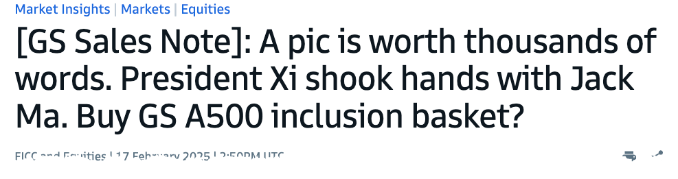 Goldmanのフィリップ・サンは、一夜にして顧客宛てに「1枚の写真は千の言葉に値する」というタイトルのメモを書いた。習主席はジャック・マーと握手した。GS A500の組み入れバスケットを買うか?