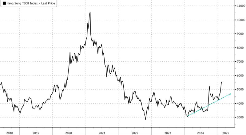 中国が1週間の春節休暇から戻ると、中国資産に対する市場心理は改善し、株式と債券の両方で強気の値動きが見られました。関税の猶予、DeepseekによるAIへの熱狂、そして容易な流動性は、すべてこの動きに寄与しました。