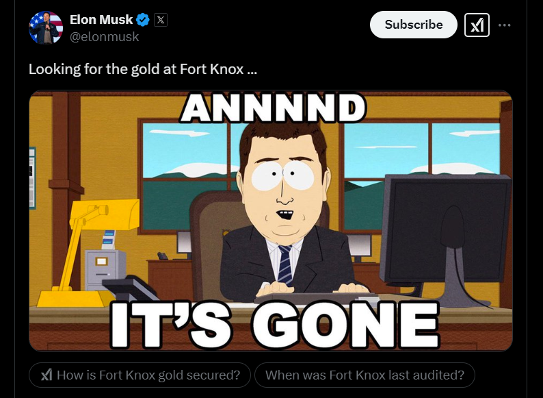 🔸マスク氏は「フォート・ノックスから金塊が盗まれていないと誰が確認しているのか?」とツイートし、Meme「そして、それはなくなった」を共有しました。😳💨