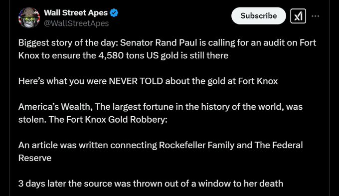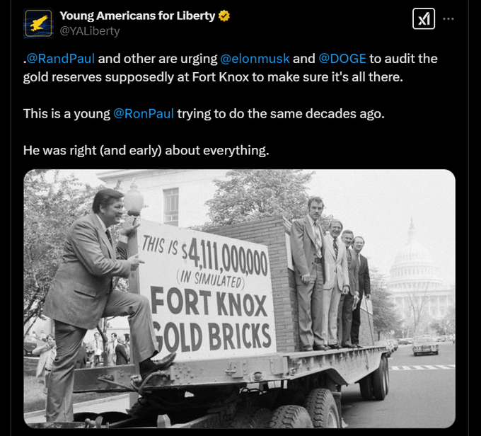 👀ランド・ポール上院議員はDOGE主導の監査を支持しています。「私は10年間、金塊を見ようとしてきた!」