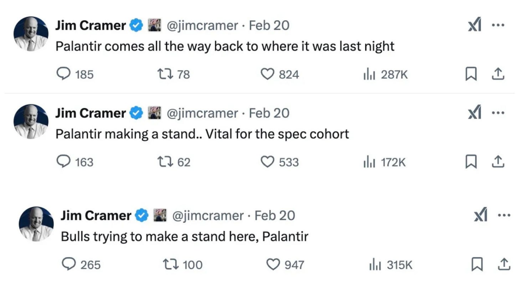 しかし、そうではありません。素粒子レベルの現実を受け入れ、そもそも株価はおそらく今日のような水準で取引されるべきではないという考えに同調するのではなく、ジム・クレイマーはTwitterで株価の動きを逐一確認し、その会社を応援しました。その口調は極めて淡々としたもので、根拠がなくとも、強気派は株価が何度でも、何度でも、際限なく倍になるはずだと言っているように私には聞こえました。ご覧ください、この「分析」を: