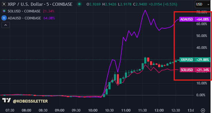 Ripple($XRP)とSolana($SOL)は、発表を受けて+30%と+21%上昇しました。