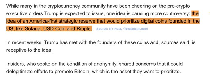 NYポストは、トランプ大統領が「米国で設立されたデジタルコインを優先する」アメリカ第一主義の暗号準備金の創設を提案する予定であると報じました。
