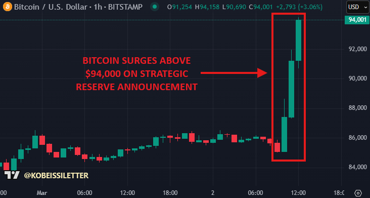 金曜日午後3時(東部標準時)以降、Bitcoin価格は78,200ドルから94,000ドル以上に急騰しました。