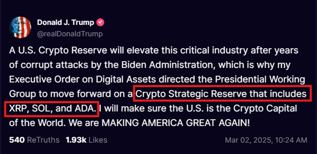 しかし、この備蓄の最初の発表では、XRP、SOL、ADAが言及されていました。