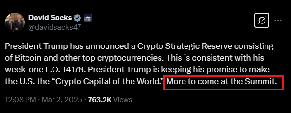 さて、トランプ大統領の暗号通貨担当補佐官である@DavidSacksは、「暗号通貨サミットではさらに多くのことが発表される」と投稿しました。