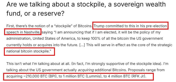 選挙運動中には、米国が22万BTCから400万BTCを取得するよう求める提案がなされていました。