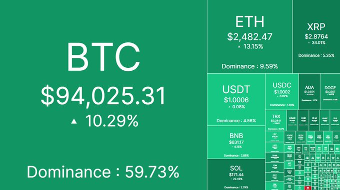 それ以来、Bitcoinは94,000ドルまで回復し、先ごろの安値から20%近く上昇しています。
