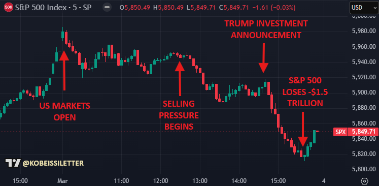 東部時間午前10時から午後3時30分の間に、S&P 500の時価総額は1兆5000億ドルも減少しました。
