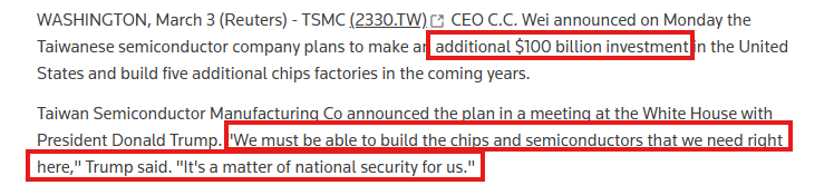- TSMの米国への投資総額は1650億ドルに