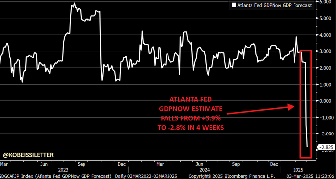 アトランタ連銀は、2025年第1四半期のGDP成長予測を2月28日の-1.5%から本日-2.8%へと、またも下方修正しました。