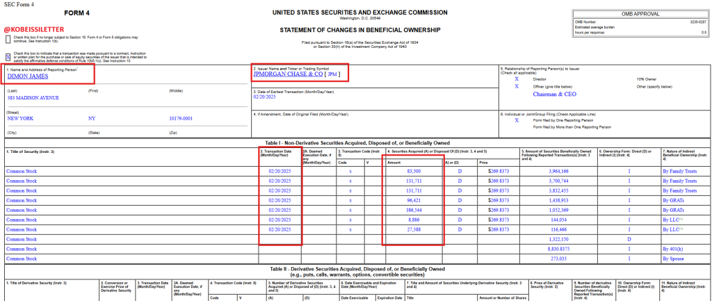 さまざまな見出しや市場の雑音が飛び交う中、ジェイミー・ダイモン氏は2月20日に大量の株式売却を行いました。