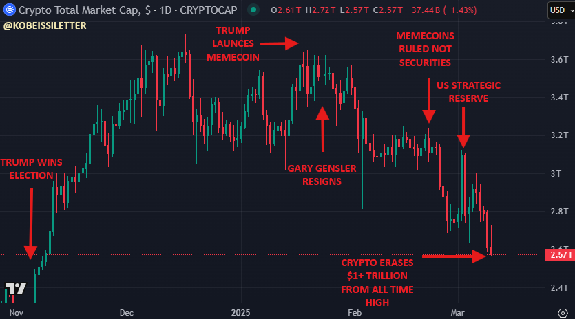 トランプ大統領の強気な公約のほぼすべてが実現したにもかかわらず、暗号通貨は1兆ドル以上下落しています。