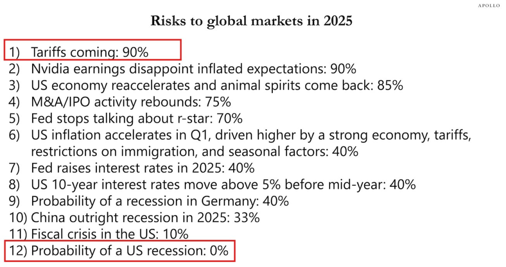 2024年12月には、アポロは2025年のリスクを公表し、米国の景気後退の可能性は0%としました。