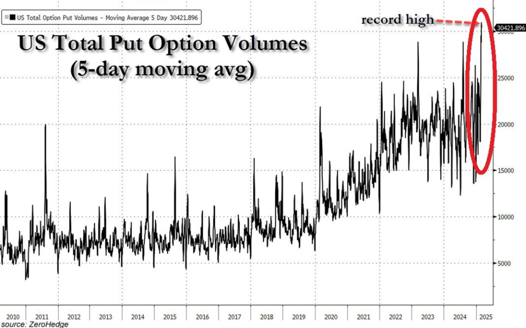 PUTオプションの取引量は過去5日間で3,000万以上の契約という記録的な水準に急増しました。
