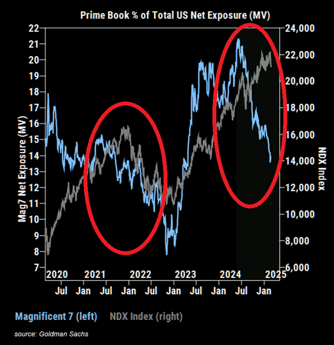 2025年を迎えるにあたり、ヘッジ・ファンドの「Magnificent 7」銘柄へのエクスポージャーは22ヶ月ぶりの低水準に落ち込みました。