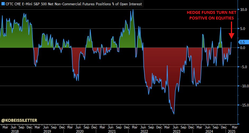 ヘッジ・ファンドは、S&P 500先物のポジションに基づき、先週、株式に対してネット・ポジティブに転じました。