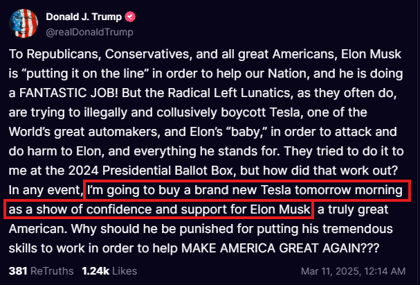 TSLAに関するトランプ氏の投稿は、センチメントが反転する可能性を示す最初の兆候である。