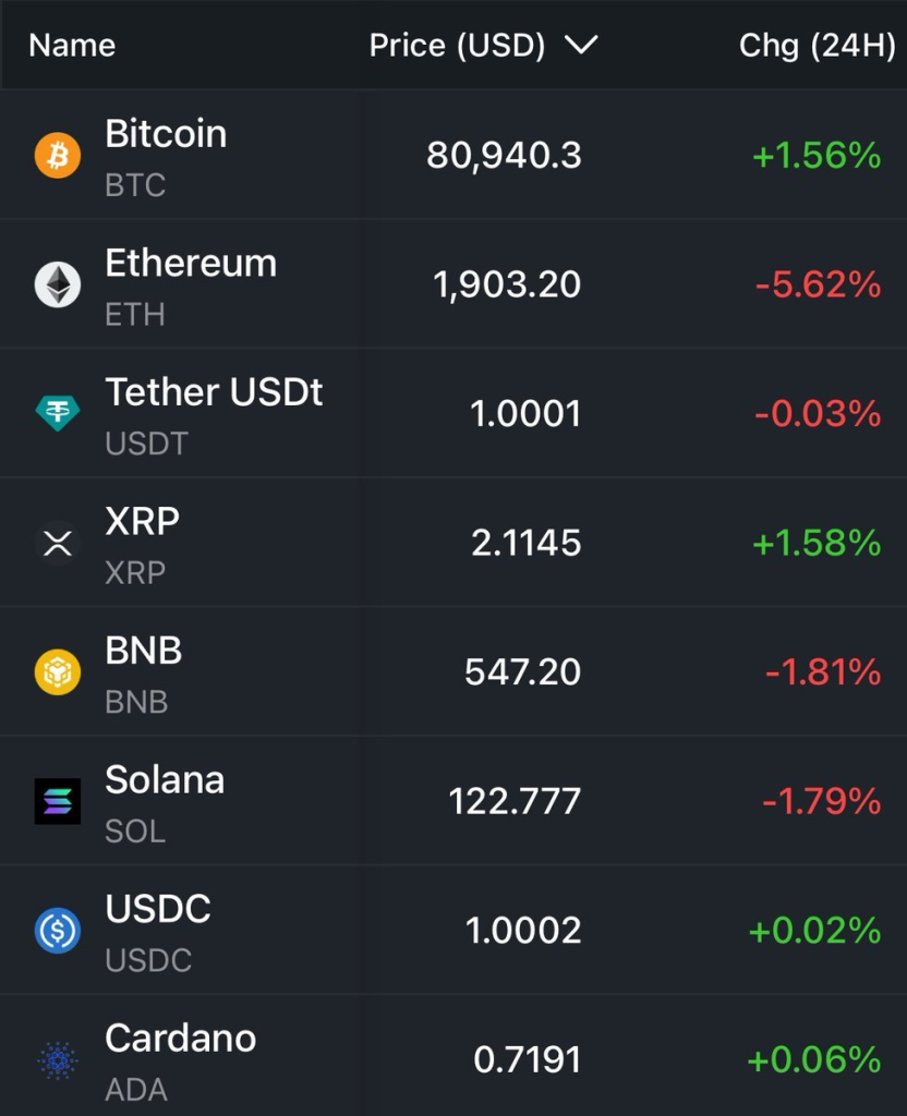 7つの銘柄が軒並み3%以上上昇し、Bitcoinは80,000ドルを回復しました。