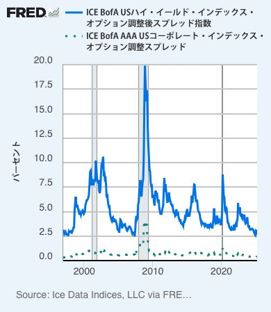 物事が深刻な悪化に向かう兆候を把握するために注目すべき信頼性の高い指標はありますか? 答えはクレジット・スプレッドです。下のグラフでご覧いただけるように、現在、本格的な金融危機にはほど遠い状況です。しかし、世界金融システムの微妙な均衡が修復不可能なほど崩れた場合、クレジット・スプレッドは急上昇し、急速に拡大する可能性があるため、安心し過ぎないようにしてください。
