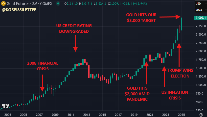 数時間前、2024年の私たちの最大の予測の一つが正式に現実のものとなりました。金価格は1オンスあたり3,000ドルという記録的な高値を付けました。