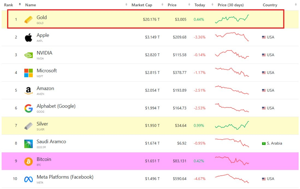 金は、トップ10の残りの資産を合計した額よりも価値が高いのです。