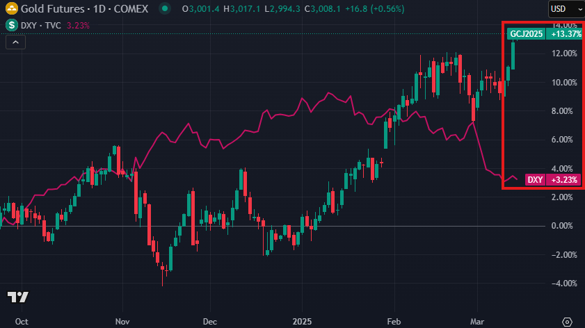 私たちは金と米ドル、$DXYの関係に注目しました。