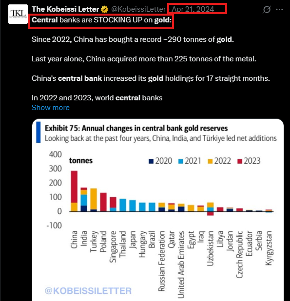 2024年初頭、私たちは中央銀行が金を買い集めていることを強調し始めました。