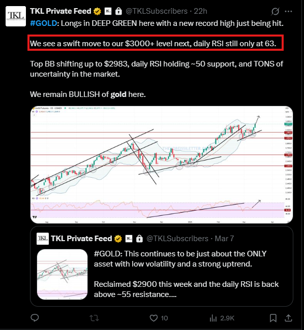 金が2950ドルを突破すると、私たちは会員に以下のように警告し、3000ドル以上への素早い上昇を予測しました。