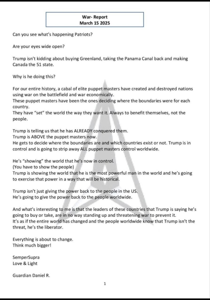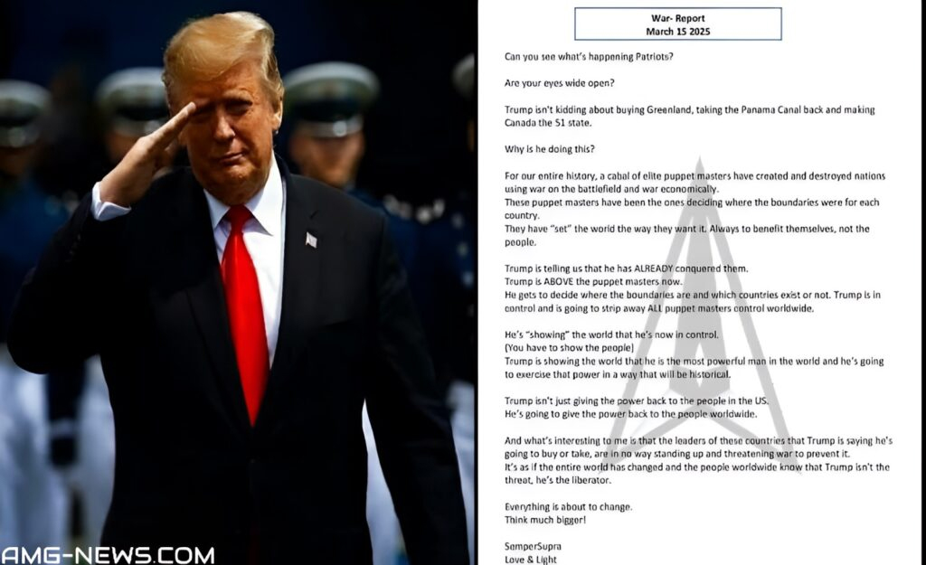 戦争報告書 2025年3月15日:トランプはグローバル・エリートを粉砕しています。グリーンランドを取り戻し、パナマ運河を占領し、カナダを米国の支配下に置いています。操り人形使いは倒れ、世界はひれ伏し、彼を止める者は誰もいません。これは完全なる支配です。今すぐ報告書全文をお読みください!