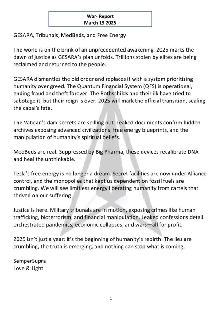 ソース:https://amg-news.com/war-report-march-19-2025-gesara-military-tribunals-med-beds-and-free-energy/