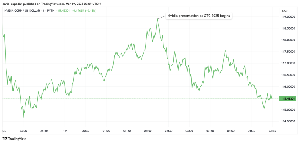 以前は、NvidiaのCEOが最新の新製品を紹介するのを投資家たちは待ちきれない様子で、そのプレゼンテーションの間、株価はどんどん高騰していました。しかし今日、それは先日の状況とは対照的で、ジェンセンが話し始めたときにNvidiaの株価はピークに達し、取引終了まで売りは絶えませんでした。