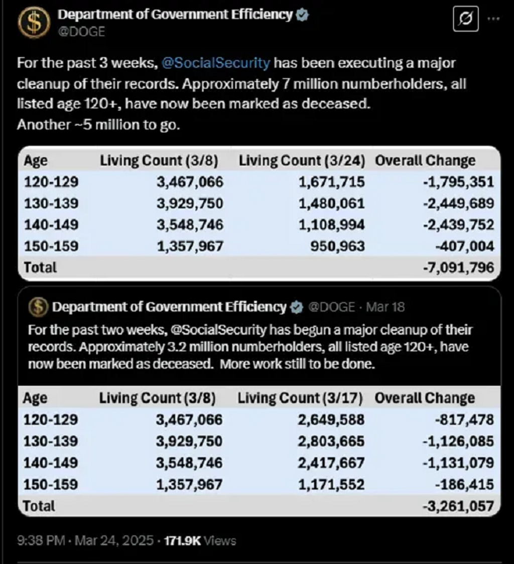 無駄な書類に2人目の署名者を追加することが彼らの考える「改革」であるようなキャリア官僚とは異なり、マスク氏はDOGEに自社の1つとして取り組んだのです。すなわち、正確性、迅速性、そして無駄を一切許容しない姿勢で取り組みました。21日足らずで、DOGEはSSAのデータベースから700万件以上の幻のエントリーを一掃しました。これらの記録は何十年も残っていたものです。