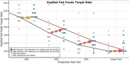 FOMCはドット・プロットを発表し、12月のドット・プロットよりも明らかにタカ派的で、2024年の利下げ幅は3回で横ばい(ただし、50bpsにとどまるとの見方が優勢)だったが、2025年以降の利下げ幅は予測から消えた…