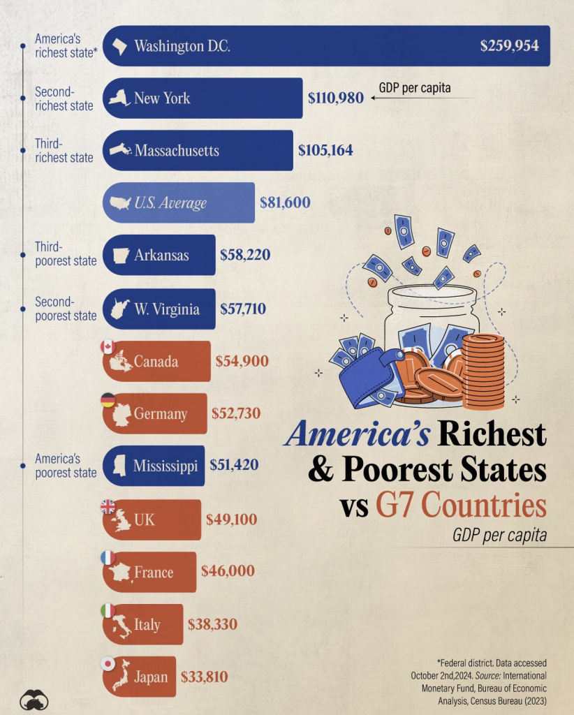 カナダが米国の州であれば、一人当たりの所得ベースでは、ミシシッピ州に次いで最も貧しい州のひとつとなります。これは、米国の安全保障の傘の下にあるという理由だけで享受している補助金、保護、外交的支援を考慮する前の数字です。